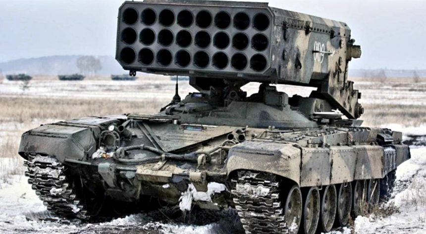 Lansatorul de rachete multiple TOS-1 sau TOS-1A văzut de CNN este capabil să lanseze rachete cu focoase termobarice.