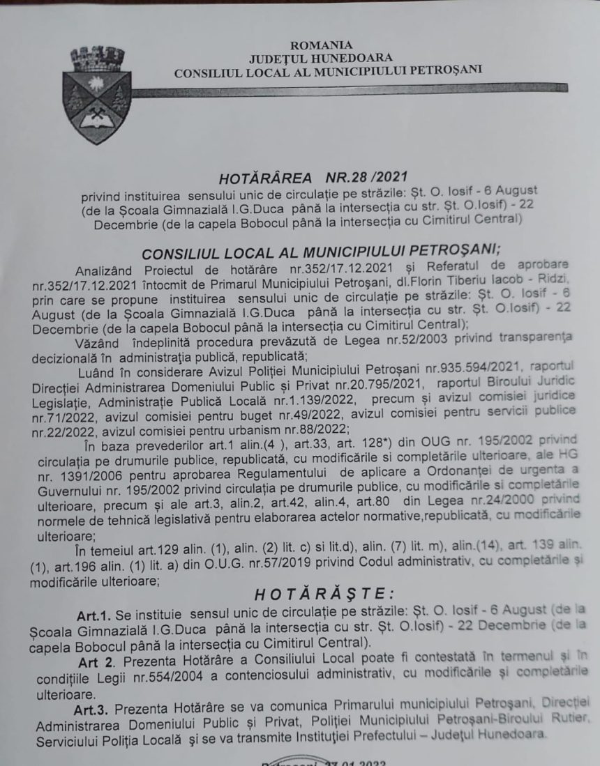 Hotărârea a fost adoptată în Consiliul Local Petroșani, după întocmirea unui memoriu tehnic justificativ cu privire la sistematizarea circulației rutiere și fluidizarea traficului în municipiul Petroșani, și are avizul Poliției Municipiului Petroșani.