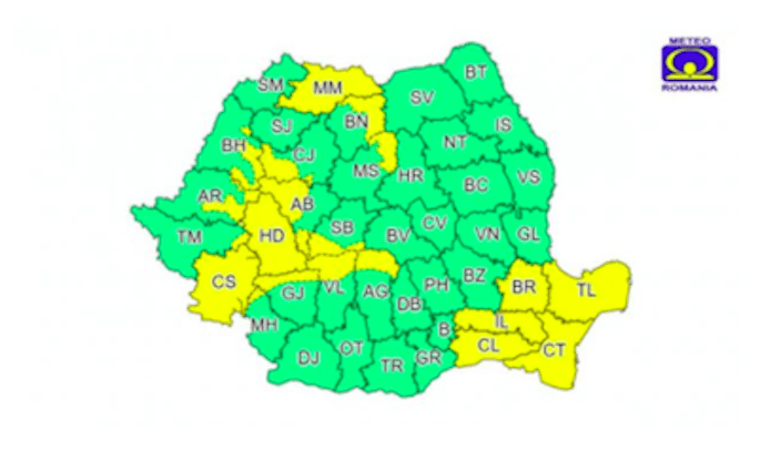 Alerta vizează județele Maramureș, Bistrița-Năsăud, Mureș, Bihor, Cluj, Alba, Arad, Hunedoara, Timiș, Caraș Severin, Mehedinți, Gorj, Vâlcea, Sibiu, Argeș, Ialomița, Călărași, Constanța, Tulcea și Brăila.