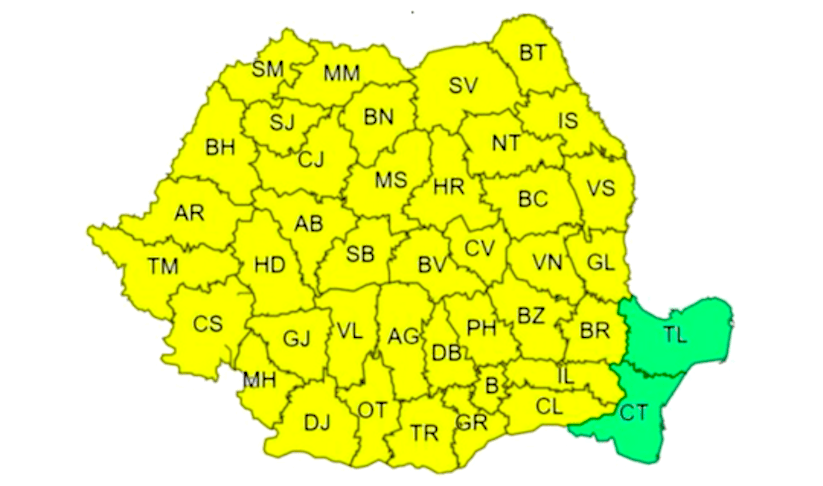 Administrația Naționala de Meteorologie (ANM) a emis o atenționare meteo Cod galben de ploi și vijelii, care vizează aproape toată țara.