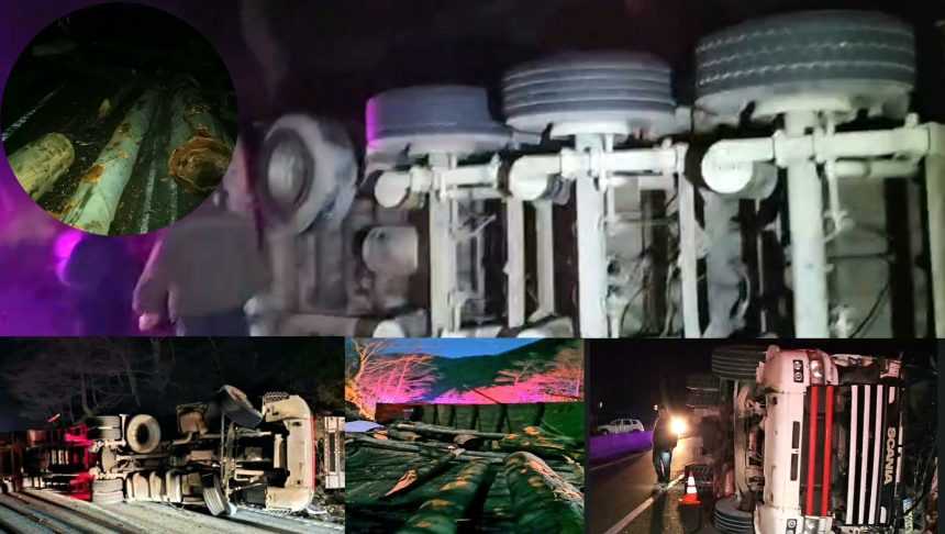 Camion încărcat cu lemn, răsturnat în Defileul Jiului