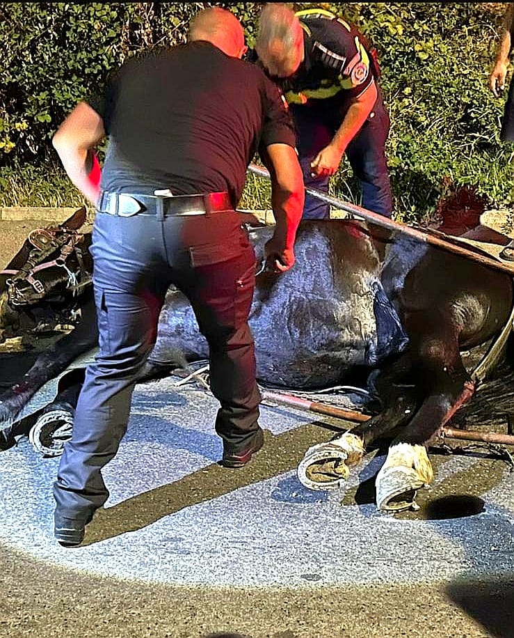 Aseară, pe strada Narciselor din Târgu-Jiu, un cal aflat în stare de agonie a fost salvat de doi polițiști de ordine publică care au acționat prompt pentru a-l elibera dintr-o situație critică. Polițiștii Bordea Cristian și Gorjanu Narcis, aflați în timpul exercitării atribuțiilor de serviciu, au observat animalul căzut pe carosabil, legat de o căruță răsturnată.