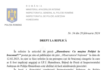 În referire la articolul de presă „Hunedoara: Cu mașina Poliției la braconat?!” postat pe site-ul publicației de știri „Observatorul Național”…